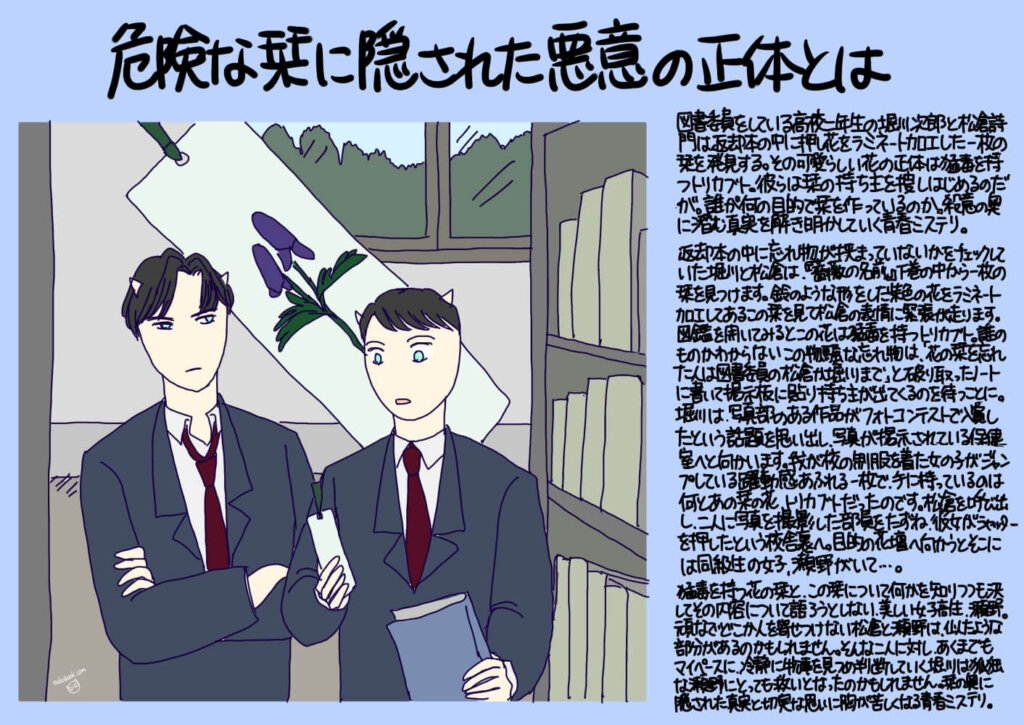 返却本の中に挟まっていた猛毒のある花を押し花にした栞の持ち主を探すミステリに興味がある