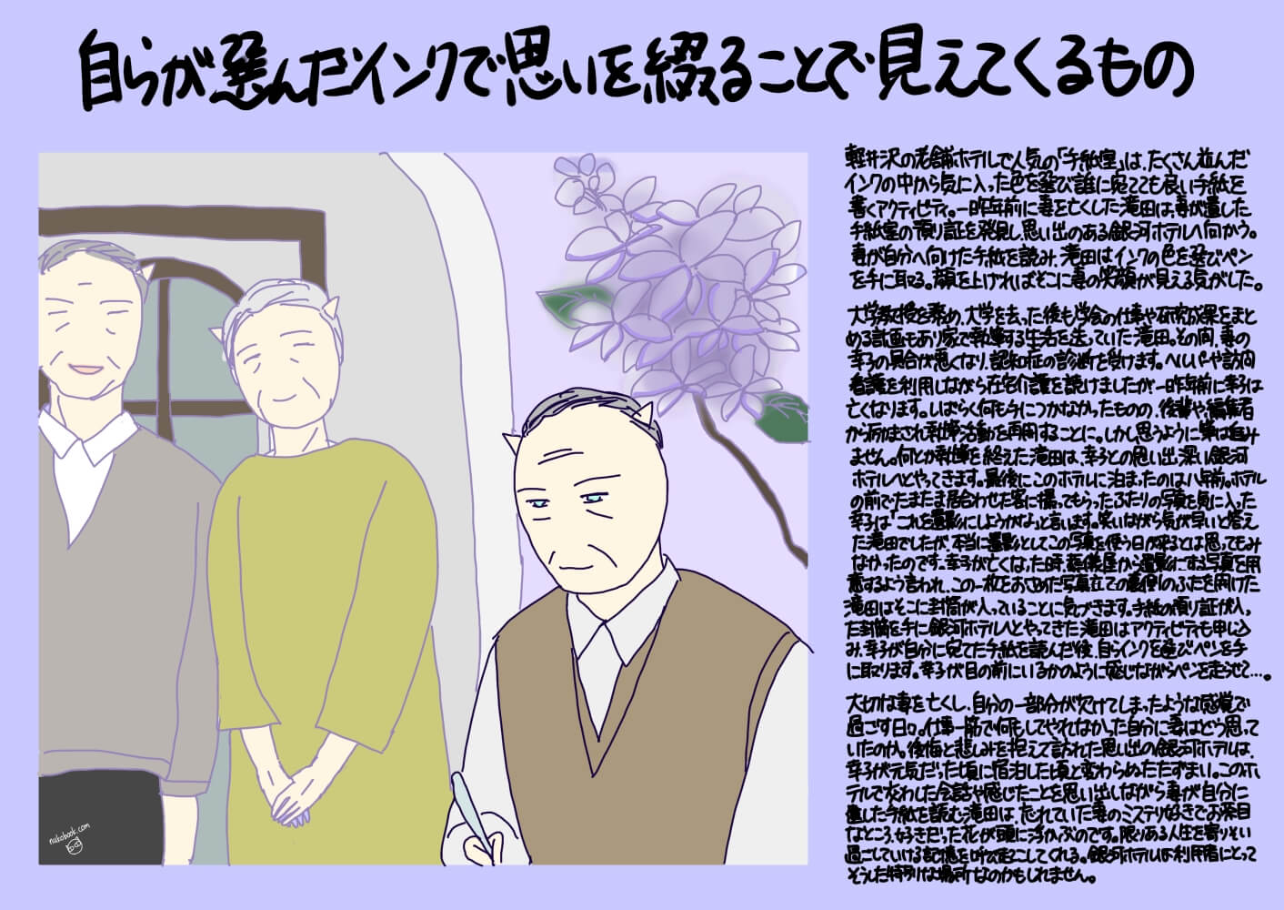 手紙の預かり証が入った封筒を手に、銀河ホテルへとやってきた滝田はワークショップも申し込み、幸子が自分に宛てた手紙を読んだ後、自らインクを選びペンを手に取ります。