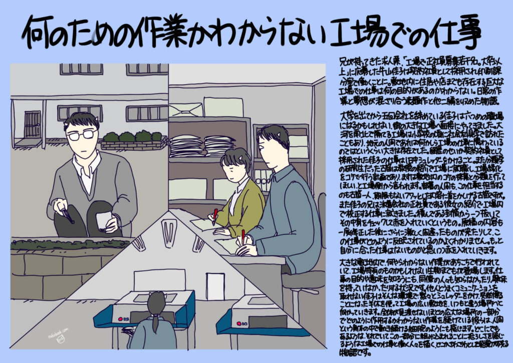 工場で働く人々やその仕事内容に疑問を持つような物語に興味がある