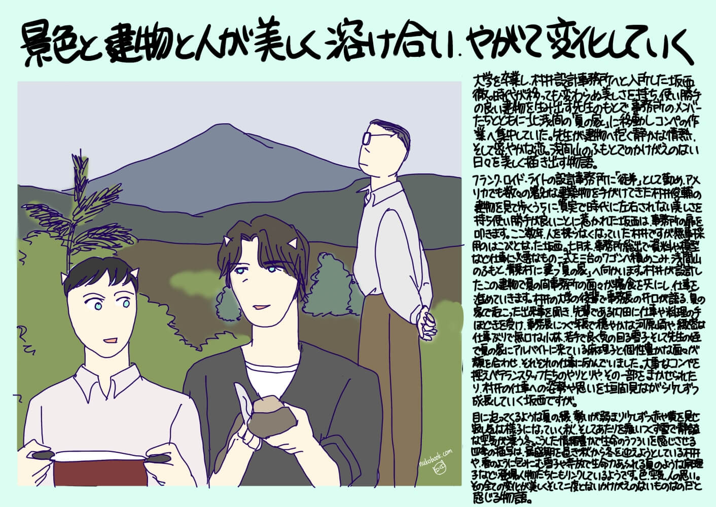 フランク・ロイド・ライトの設計事務所に「徒弟」として勤め、アメリカでも数々の著名な建築物を手がけて来た村井俊輔の建物を見て歩くうちに、質実で時代に左右されない美しさを持ち使い勝手が良いことに惹かれた坂西は、事務所の扉を叩きます。