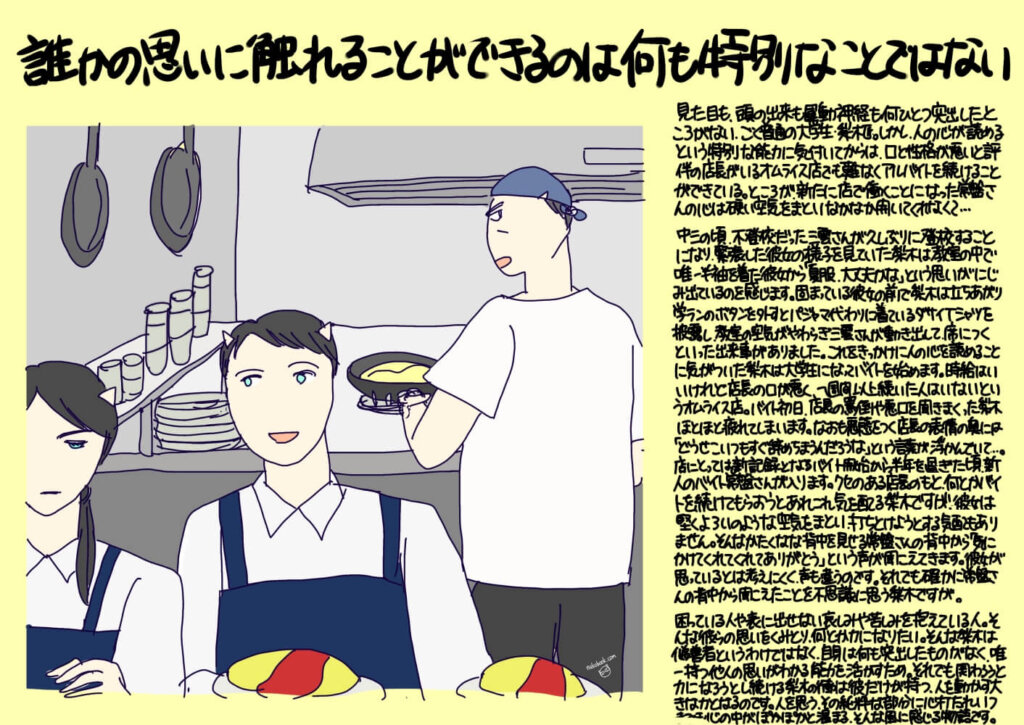 しかし、人の心が読めるという特別な能力に気づいてからは、口と性格が悪いと評判の店長がいるオムライス店でも難なくアルバイトを続けることができている。