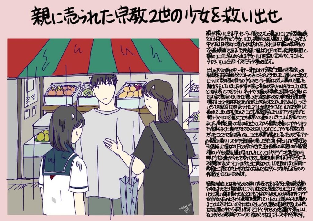 宗教2世の子供が親や教祖に振り回されるトラブルから誠たちが救い出す話を読んでみたい