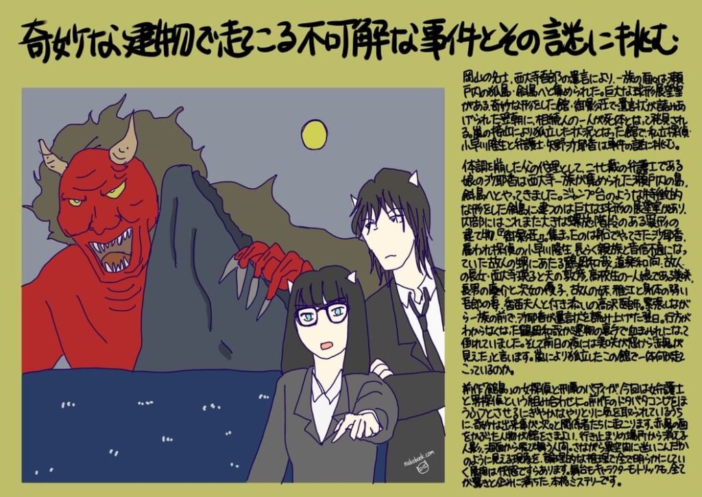 前作「館島」の女探偵と刑事のバディが、今回は女弁護士と男探偵という組み合わせに。
